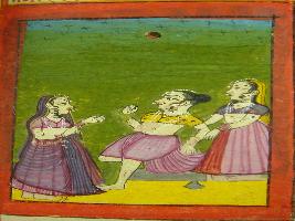 | Description / विवरण | Leaf from illustrated manuscript of Dhola Maru depicting Marwani after taking bath and are dressing up with help of two maids. This manuscript has 111 pages with 35 illustrations. |