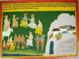 | Description / विवरण | Miniature painting based on Harivansha depicting at the lower right part, Brahamadatta doing Ashwamegh yagna. Many sages like Jabali, Vyas, Sumant, Deval, Yagnavalkya, Jemuni and Vasudev and Devki are also seen in the yagna. At the left side a kingdom is seen. |