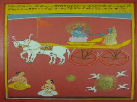 | Description / विवरण | Miniature painting based on Shri Bhagwat Gita. It depicts Krishna preaching Arjun the holy Gita and telling him, and telling him that do not think of your life and do your duty. |