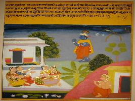 | Description / विवरण | Miniature painting based on Krishna charit - Sur Sagar depicting Rag Saranga, the son of Rag Megh. On the painting Krishna is seen that roaming in the garden and four gopis are talking about him. While another man is seen in left lower corner of the painting playing Mangra. |