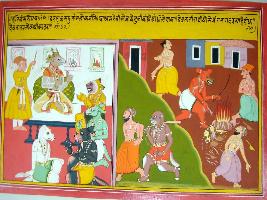 | Description / विवरण | Miniature painting based on Harivansha depicting Hiranyakashyap, who conquered all three lokas, talking to demons in his court. At the left side depiction of army of Hiranyakashyap torturing the sages and disrupting the yagna. |