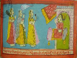 | Description / विवरण | Leaf from illustrated manuscript of Dhola Maru depicting Marwani with her went to meet Dhola who is sitting inside palace. This manuscript has 111 pages with 35 illustrations. |