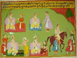 | Description / विवरण | Miniature painting based on Raghuvansha. On the upper part a king is depicted with a person. On the lower part a king is shown talking to a man, then a woman and he is depicted riding a horse and he is surrounded by three attendants holding bow and knife. |