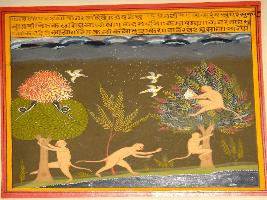 | Description / विवरण | Miniature painting based on Panchtantra. In this painting a natural scene has been depicted in which two trees are shown on the bank of a river. Four monkey are also depicted on the top of a tree two climbing the tree one between the two tree. Three birds are flying and its raining and dark clouds can be seen on the uppermost part of the painting. |