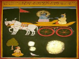 | Description / विवरण | Miniature painting based on Shri Bhagwat Gita. It depicts Krishna preaching Arjun that one who control over all his senses is able to learn everything. |