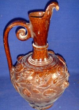 | Description / विवरण | Jar red in colour with flat circular base, long neck and handle. Body part is having embossed creeper designs. |