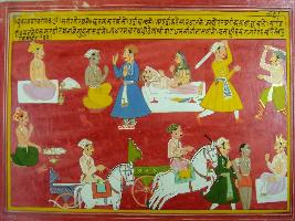 | Description / विवरण | Miniature painting based on Mahabharat - Udyam parva. It is telling that body is charoit and soul is the driver, senses are the horses, one should keep in control all this, one who leaves the way of Dharma and Artha and try to take over another wealth and woman he is like Asur. |