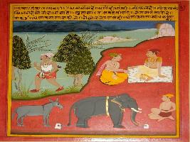 | Description / विवरण | Miniature painting based on Panchtantra depicting a hunter, facing right in a hungle at the upper right side. At the upper left corner the sun is seen behind a mound. Below it two men are seen talking to each other. Below them, on ornamented elephant is seen, in front of which a man is sitting. The elephant is tied with a chain and behind the elephant a donkey is seen. |