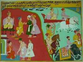 | Description / विवरण | Miniature painting based on Raghuvansha. On the left side is the depiction of king talking to three persons and below them, three persons are giving water to one. On the right side a king is sitting on chariot pulled by two horses and two men on horse, one man on an elephant and two men walking. |