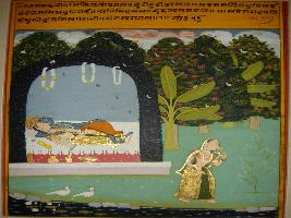 | Description / विवरण | Miniature painting based on Krishna charit - Sur Sagar depicting Rag Ramkali, ragini of nag Hindol. It is a scene from Vrindavan. Krishna and Radha depicted sleeping together in a bower, and a woman is depicted away from them. |