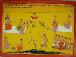 | Description / विवरण | Miniature painting based on Mahabharat - Vana parva depicting sage Lomash is pointing towards Yamuna and says on the bank of this river many sages and king Nahuk performed yagna. |