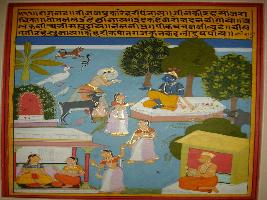 | Description / विवरण | Miniature painting based on Krishna charit - Sur Sagar depicting Rag Nata, the Ragini of Rag Deepak. On the upper part animals paying respect to Krishna. After that the gopi come to Radha and describing her about this. At the lower left Surdas is depicted narrating the story. |