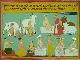 | Description / विवरण | Miniature painting based on Mahabharat - Udyam parva. Vidur is telling the king just like cows been tied do not tie us. Do not set like Indra who tied cloud make him vain. Whenever he wishes, let the Brahmans, women, free. |