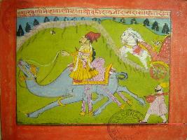 | Description / विवरण | Leaf from illustrated manuscript of Dhola Maru depicting Dhola leaving in his camel with servant and horse chariot given by Marwani. This manuscript have 111 pages with 35 illustrations. |