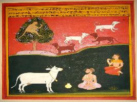 | Description / विवरण | Miniature painting based on Panchtantra. In the upper scene two white dog is depicted and monkey on a tree. On the lower scene a cow and a couple is depicted along a golden pot placed between cow and the men. |