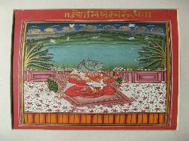 | Description / विवरण | It is a painting in which Jyotish swarupa god is shown holding a rosary and sitted on a mat, by a pillow, with mountain background. |