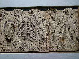 | Description / विवरण | It is a machine made lace made in Nottingham. Its design is reverse arch shaped with thin net and decorated with dots and floral pattern in this lace. Lace is in the semicircular shaped. |