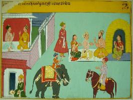 | Description / विवरण | Miniature painting based on Raghuvansha depicting a king in his palace, discussing with his minister. In left part, he is depicted with queen, outside a hermitage with folded hands on front of sage. An elephant rider and horsemen are also there. |