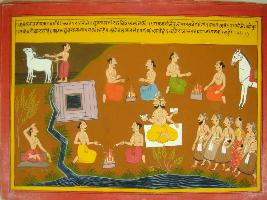 | Description / विवरण | Miniature painting based on Mahabharat - Vana parva depicting performing of yagna in the forest of Kurukshetra. A holy river is depicted in the painting. At the lower left corner Pandavas are seen with Lomash sage. |
