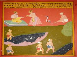 | Description / विवरण | Miniature painting based on Panchtantra depicting Chakradhar telling the story of three fishes namely Sahastrabudhi, Sanbudhi and Ekbudhi who are caught by a fisherman one day. |