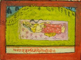 | Description / विवरण | Leaf from illustrated manuscript of Dhola Maru depicting Marwani sleeping on ground and a snake coming towards her. This manuscript has 111 pages with 35 illustrations. |