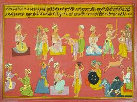 | Description / विवरण | Miniature painting based on Mahabharat - Udyam parva. It is depicted here that king should consider its subjects equally and the without any biasness like a cold water and sun, one who do not this is like hunter who kills deer and he will finish one day just like ocean finishes when land comes. |