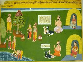 | Description / विवरण | Miniature painting based on Raghuvansha depicting two Rishi kanyas filling water pots from river and pouring it in tree. In left part, two sages are sitting outside their hermitage with their wives and deers around him. |