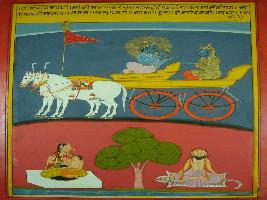 | Description / विवरण | Miniature painting based on Shri Bhagwat Gita. It depicts Krishna preaching Arjun that the person who takes Vairagya and leaves ego to Him, birth, death, happiness or sadness do not play any role for him. |