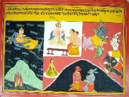 | Description / विवरण | Miniature painting based on Harivansha depicting Lord Brahma coming out of navel of sleeping Vishnu at top right. In the left, two sages are shown pleading to Lord Indra. At the lower portion. Two demons- Tarakasur and Kalnenu sitting and talking. At the top left portion, Vishnu is sitting over Garuda and fighting with demons. |