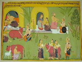 | Description / विवरण | Miniature painting based on Raghuvansha depicting sleeping with wife, next to it a king and queen are greeted by a sage and his wife. Below, the queen is worshipping a cow, with an Aarti- plate, by revolving around it, while the king is standing. |