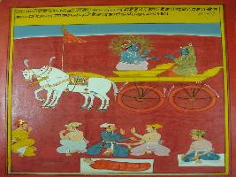 | Description / विवरण | Miniature painting based on Shri Bhagwat Gita. It depicts Krishna preaching Arjun that the man who has jealousy wish he is never became a perfect man. |