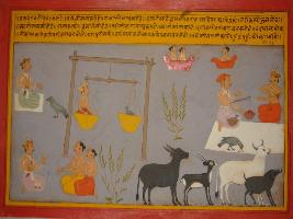 | Description / विवरण | Miniature painting based on Mahabharat - Vana parva depicting Sapen, king, bull, cow and boar at upper right part. Sapen asked king to bring meats equal to meat of one pigeon. He is shown cutting his part of his hand in order to equal the weight. He equals it, Sapen revealed himself as king Indra and took king with him to Swarglok. |