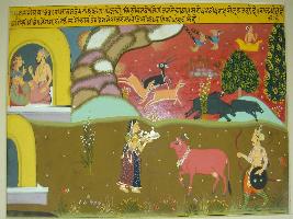 | Description / विवरण | Miniature painting based on Raghuvansha depicting a sage and his wife sitting on right upper part. Below, king is shown with bow and arrows and his wife worshipping a cow standing in between them. At the background, a scene of forest with wild boars, deers and peacocks is depicted. |