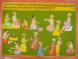 | Description / विवरण | Miniature painting based on Mahabharat - Udyam parva depicting brihaspati telling Indra that educated people do worships, leave the ill activities, and appriciate intelligent peoples. He also says that one should serve parents, Agni, guru and the soul, and one should worship sevtas, human beings, beggers and guests. |