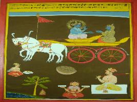 | Description / विवरण | Miniature painting based on Shri Bhagwat Gita. It depicts Krishna preaching Arjun that person should have control over his ego, some and soul. |
