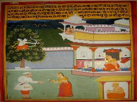 | Description / विवरण | Miniature painting based on Krishna charit - Sur Sagar depicting Rag Malhar, ragini of rag Megh. On the upper part of the painting Kamdev is depicted sitting on a tree and making aim with his bow and arrow, and a woman sitting in a palace and on the lower part a woman depicted giving some message to a man and Surdas playing Manjeera in lower right corner. |