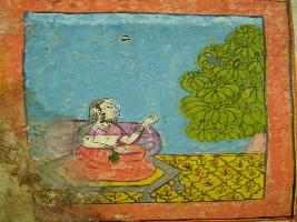 | Description / विवरण | Leaf from illustrated manuscript of Dhola Maru depicting Maru sitting on couch, and facing left. This manuscript has 111 pages and 35 illustrations. |