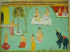 | Description / विवरण | Miniature painting based on Raghuvansha depicting yogis in different poses and two nobles talking with each other. In lower part a noble is seated with a child on lap and an elephant is tied with chain. In upper left corner, Indra is depicted with a Brahman. |