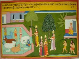 | Description / विवरण | Miniature painting based on Krishna charitra - Sur Sagar depicting Rag Dev Gandhar, son of rag Megh. At the right side Krishna is milking a cow and gopas are standing near him. At the centre cow maidens are bringing milk on their heads. At the upper left poet Surdas is depicted narrating the scenes. |