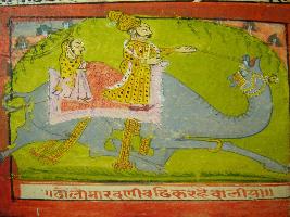 | Description / विवरण | Leaf from illustrated manuscript of Dhola Maru depicting Dhola taking Marwani in his camel. This manuscript has 111 pages with 35 illustrations. |