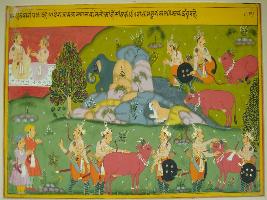 | Description / विवरण | Miniature painting based on Raghuvansha depicting a scene of forest in which king Mumari son s Tejasui is shown in different positions with a cow. |