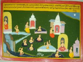 | Description / विवरण | Miniature painting based on Mahabharat - Vana parva depicting a Salgram. Sages are depicted in a hut, Pandavas are depicted taking bath in a pond. Two persons are depicted bathing. |