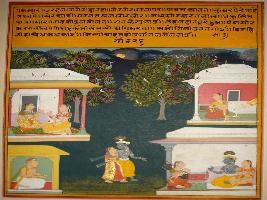 | Description / विवरण | Miniature painting based on Krishna charit - Sur Sagar depicting Rag Malhar, the Ragini of Sur Sagar depicting on the painting Krishna is seen along with Radha in the centre while Radha is again seen with an another female and a musician is playing Veena in front of Radha and Krishna. |