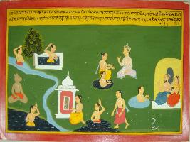 | Description / विवरण | Miniature painting based on Mahabharat - Vana parva depicting Shukracharya telling about way to different tirths. At the extreme left, Mantang rishi s ashram is depicted with rishi and his wife sitting outside their house. Then he would meet Maniman snake and visit the temple. At the lower left, river is depicted with man taking bath. Next would came Gautam rishi s ashram. At the upper right part, pond of raja Janak is depicted with man taking a bath. Then he should go to Kurukshetra and then Galata ji. He would reach swarg lok. |