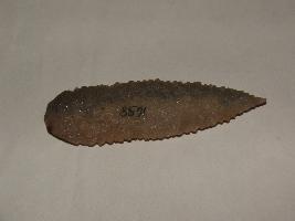 | Description / विवरण | It is a paleolithic stone Denticulated Blade having zigzag edge and conical tip. |