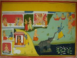 | Description / विवरण | Miniature painting based on Krishna charit - Sur Sagar depicting scenes from Mahabharat, Vishnu incarnation of Narasimha with Prahlad standing nearby and Vishnu rescuing Gajendra Gajendra Moksha . |