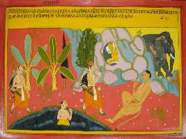 | Description / विवरण | Miniature painting based on Mahabharat - Vana parva depicting that Bhim is running in the Uni hill where many animals are living. After taking bath Bhim again begins to walk and on the road he meets Hanuman. |