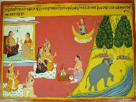 | Description / विवरण | Miniature painting based on Raghuvansha. On the left side, the king and queen are talking to a woman and man respectively, then they are performing yagna and on the right side an elephant is depicted roaming in jungle. |
