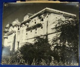 | Description / विवरण | Black and white photograph of view of facade of Kishori Rani Mahal of Bharatpur. |