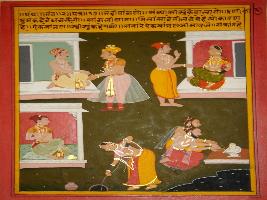 | Description / विवरण | Miniature painting based on Panchtantra depicting one man sitting on a balcony and taking to another man. Next to them at the upper left side, one male and a female sitting in a balcony is seen talking to each other. At the lower right one man is seen sitting on a balcony and facing left. At the centre, one female is seen pulling out water from a pond. Next to her, at the lower left corner two men facing left and worshipping a Shiv linga. |